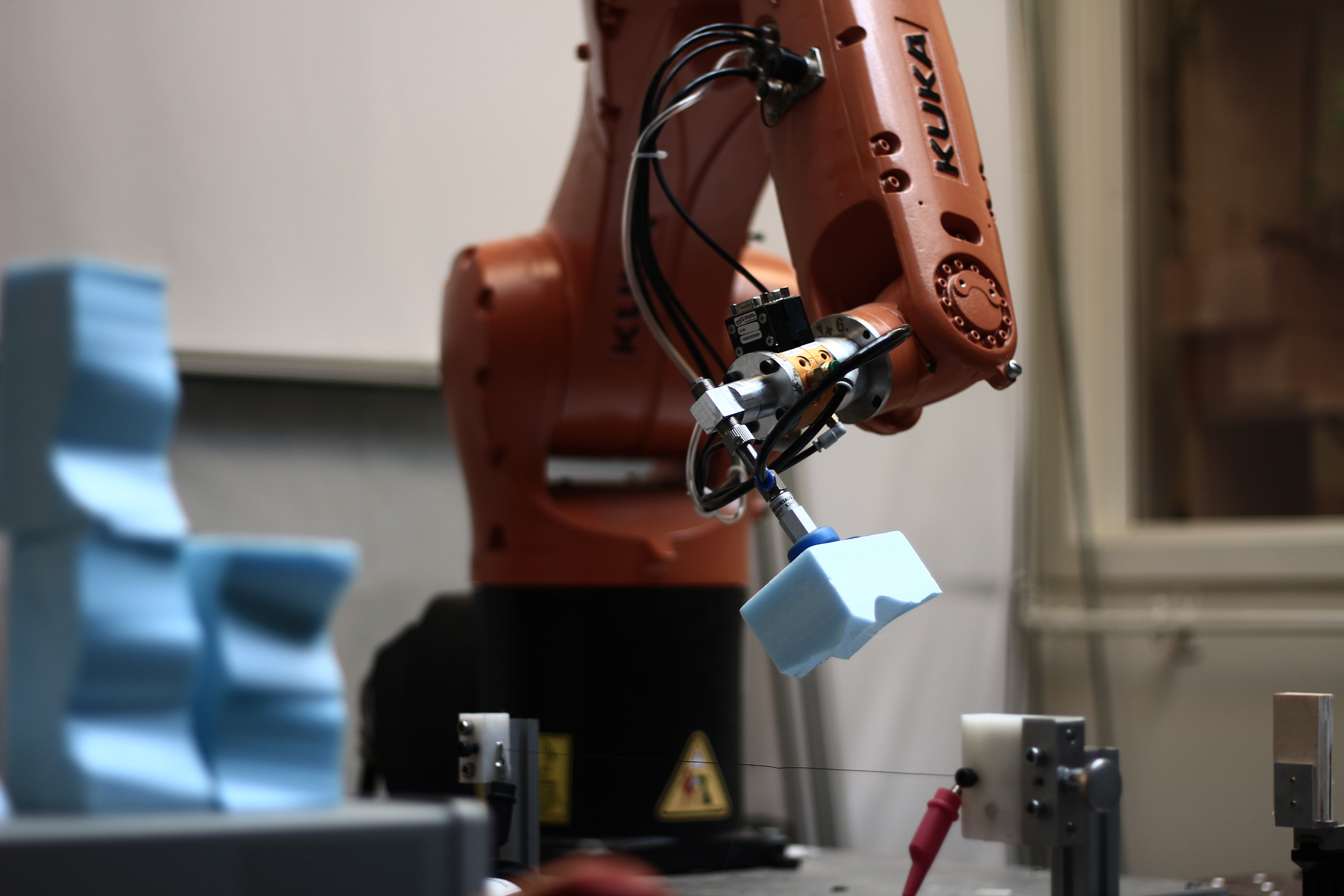 The students learned about interfacing with the digital and analog IO, the basics of work visual, programming in KRL, and producing circuits to interface with custom sensors and tooling